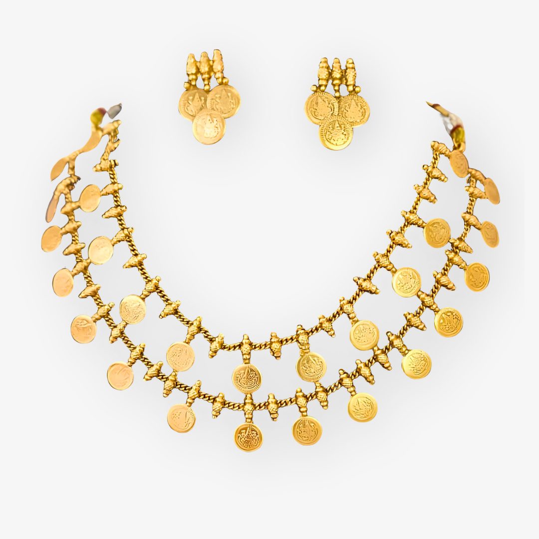 A statement two-layer coin necklace set, crafted in brass with a matt gold-plated finish. Paired with matching earrings, this geometric design is perfect for weddings, festive occasions, and cultural celebrations.