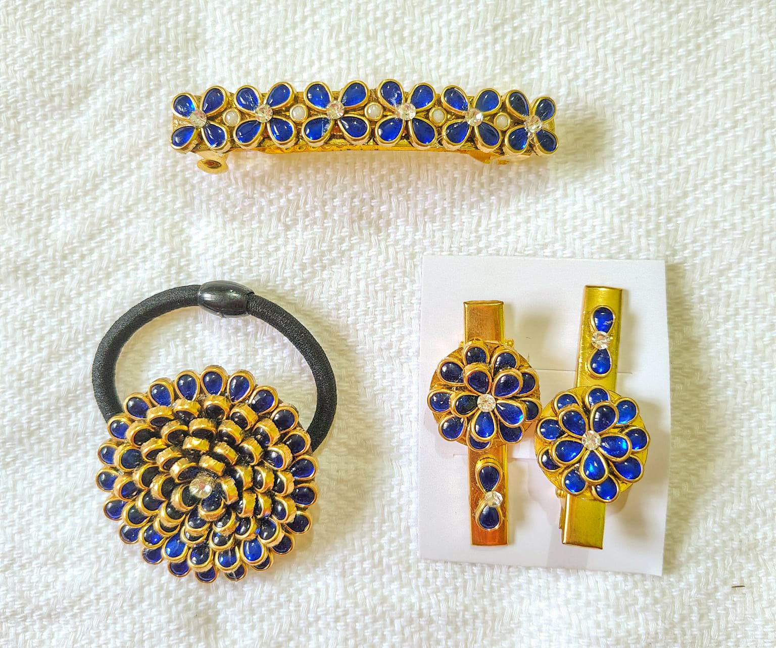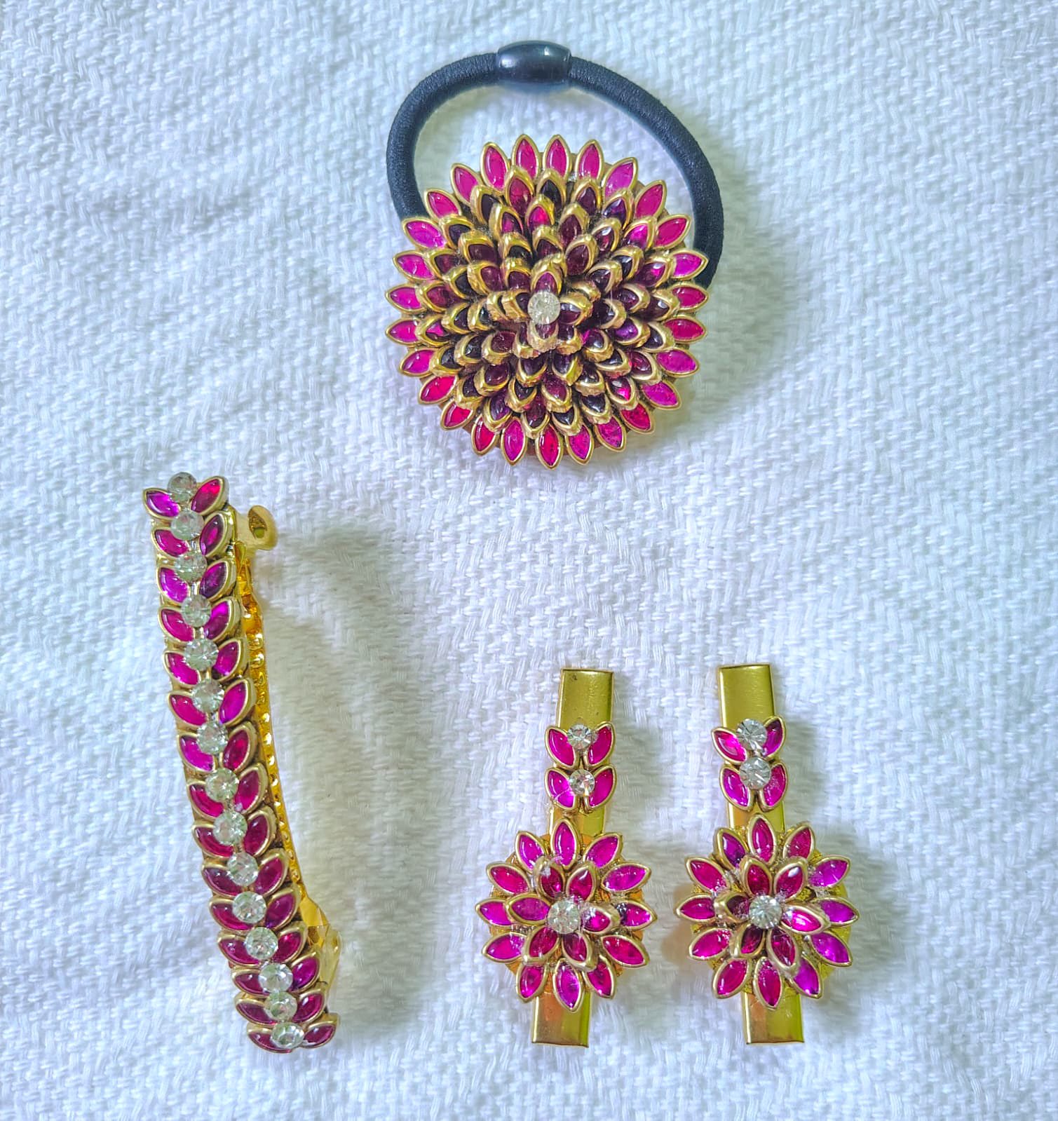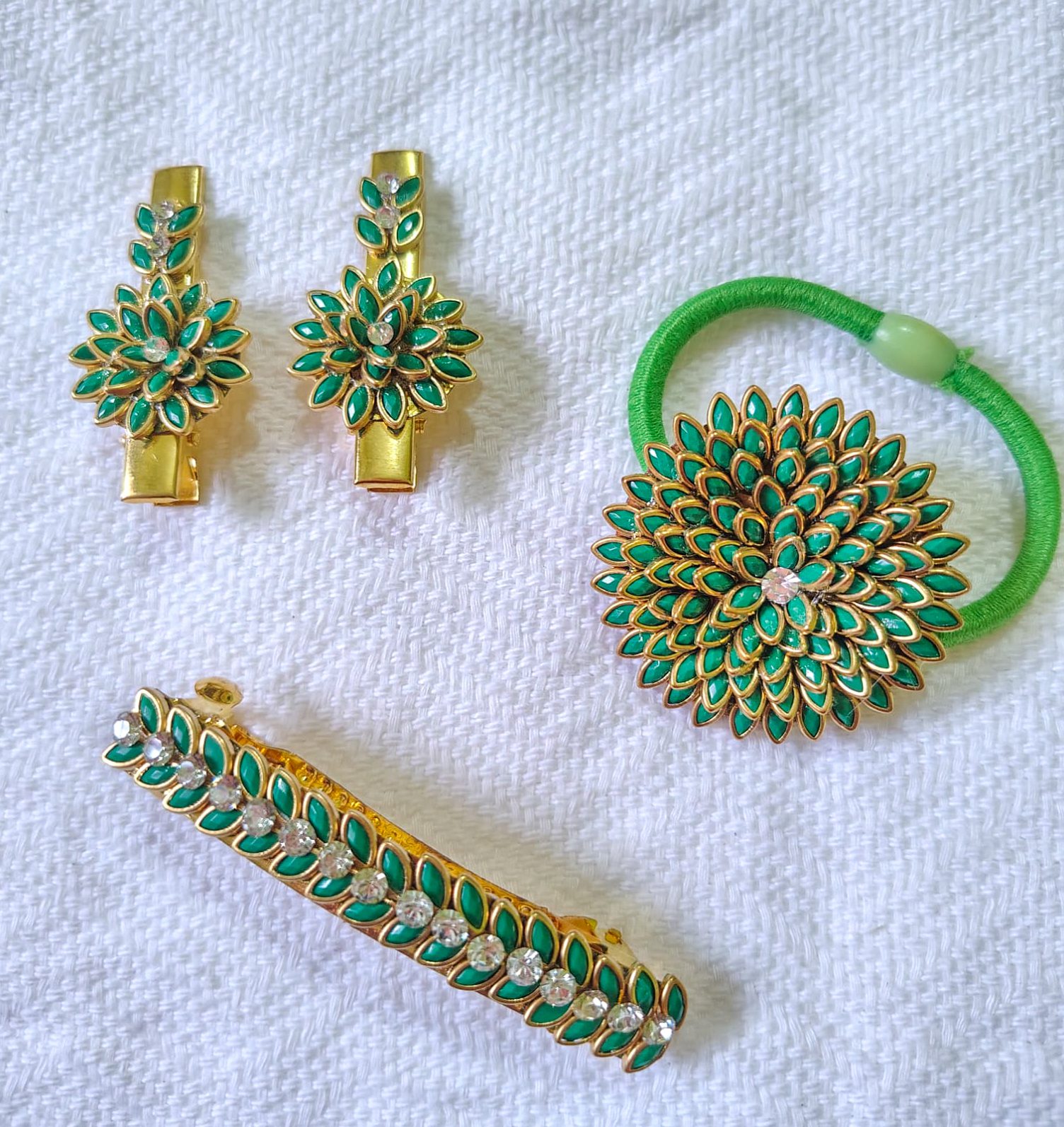 A complete set of stylish hair accessories – includes a silk hairband, elegant alligator clips, and a chic centre clip. Perfect for daily wear or special occasions. Designed for women and girls who love effortless elegance.