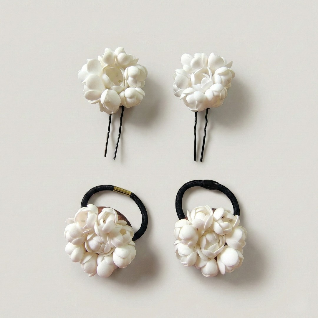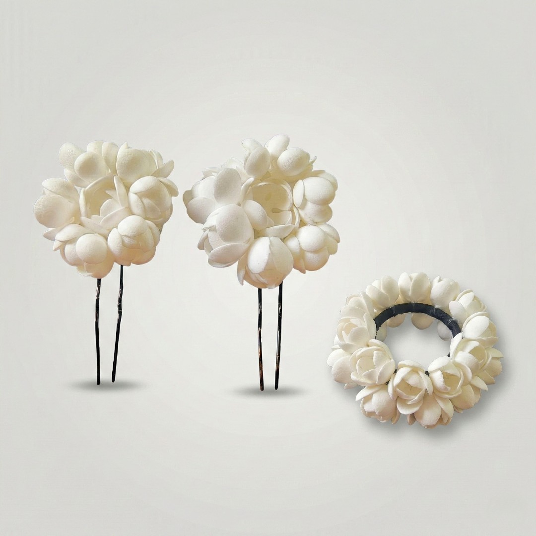 Designed to mimic the softness and fullness of real jasmine, this accessory set blends tradition with convenience, making it perfect for both everyday ethnic styling and special occasions.