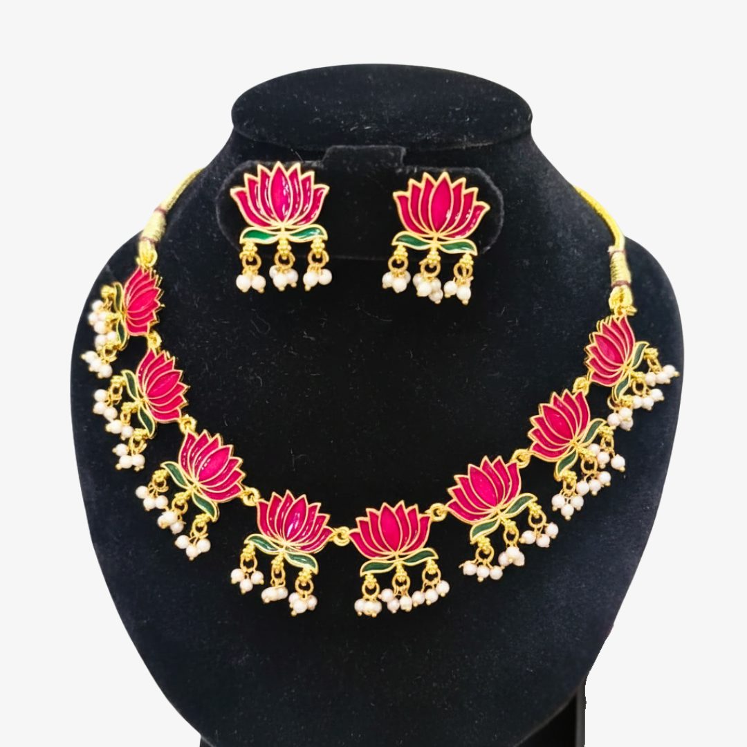 An exquisite gold-plated brass necklace set with lotus-inspired detailing, artificial stones, and delicate beads. Lightweight and elegant, perfect for weddings, festive occasions, or everyday sophistication.