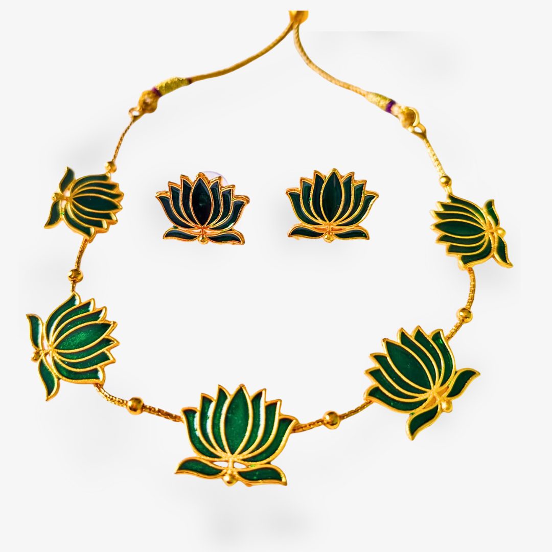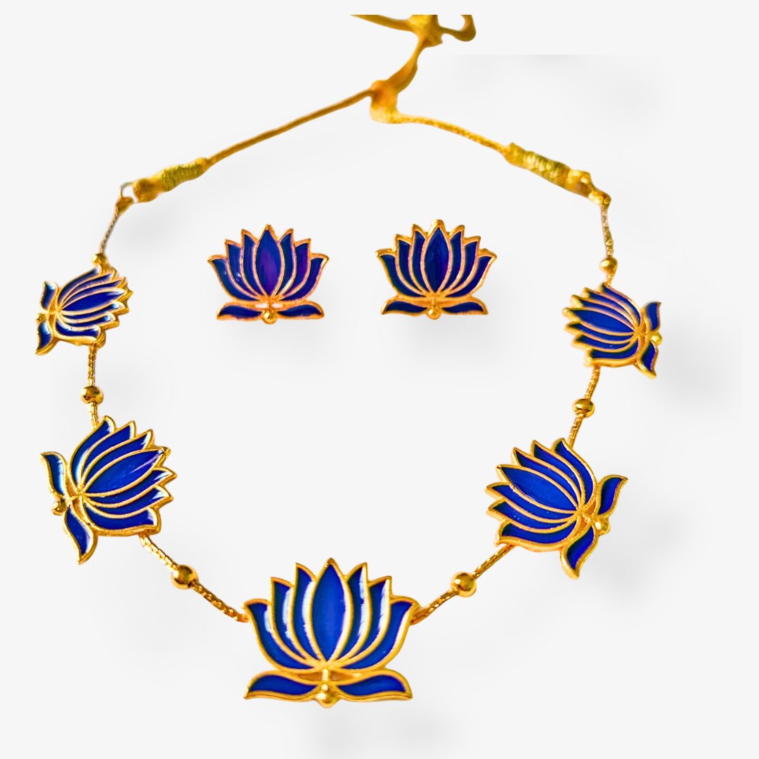 A vibrant multicolour lotus necklace set designed in brass with a gold-plated finish. Available in shades of pink, black, blue, green, and maroon – the perfect floral accessory for weddings, festive occasions, and statement styling.
