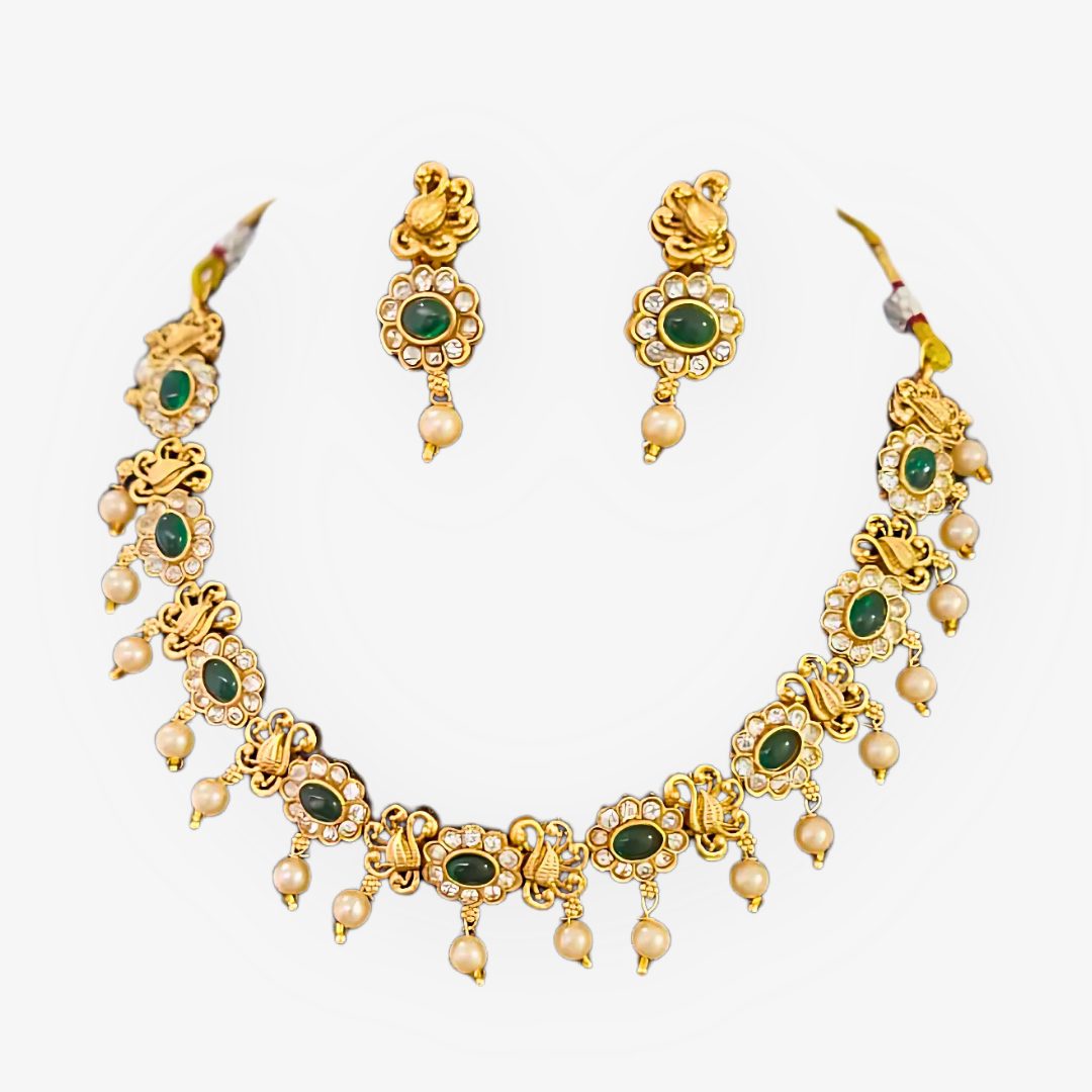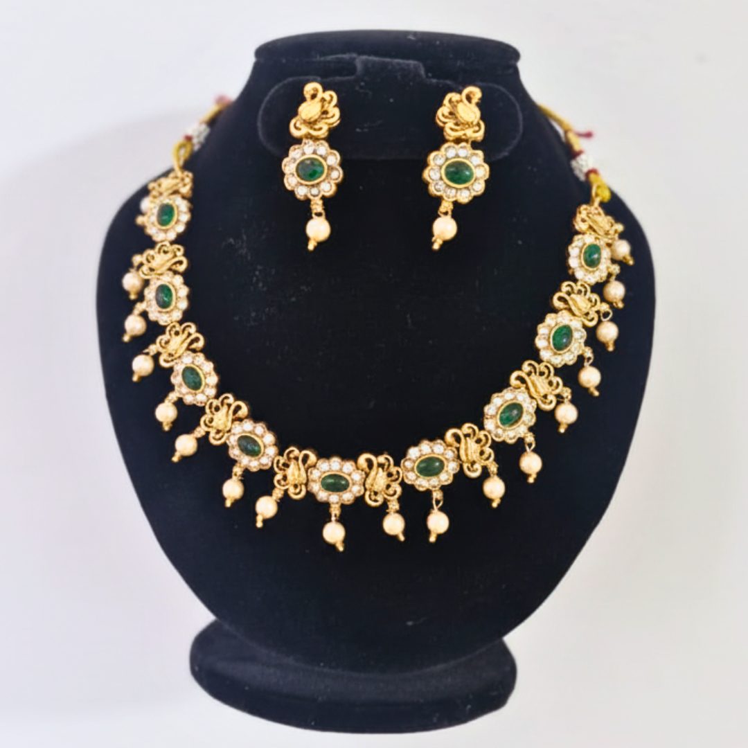 The peacock, a symbol of beauty and prosperity, makes this necklace set a statement piece in every woman’s jewellery collection. Pair it with sarees, silk attire, or lehengas for a regal traditional look.