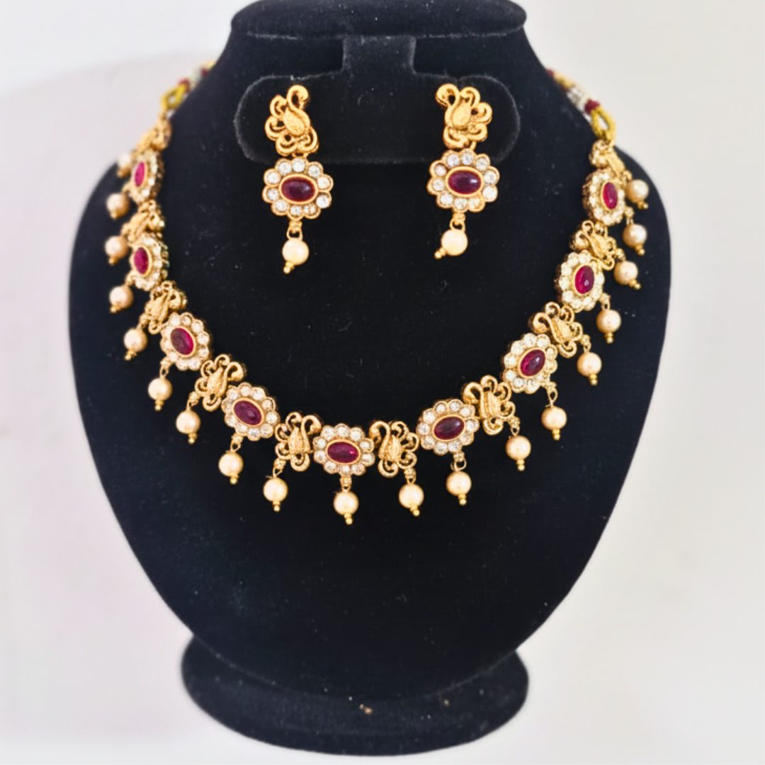 An elegant peacock motif necklace set, crafted in brass with a radiant gold-plated finish. Available in maroon, green, and green–maroon dual tones, complete with matching earrings. Perfect for weddings, festivals, and temple wear.